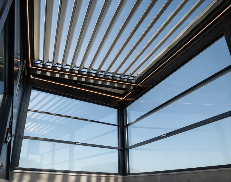 Dacă nu vrei doar un acoperiș închis / deschis, acoperișul cu lamele retractabile este soluția. Controlezi total lumina și ventilarea naturală a spațiului.
